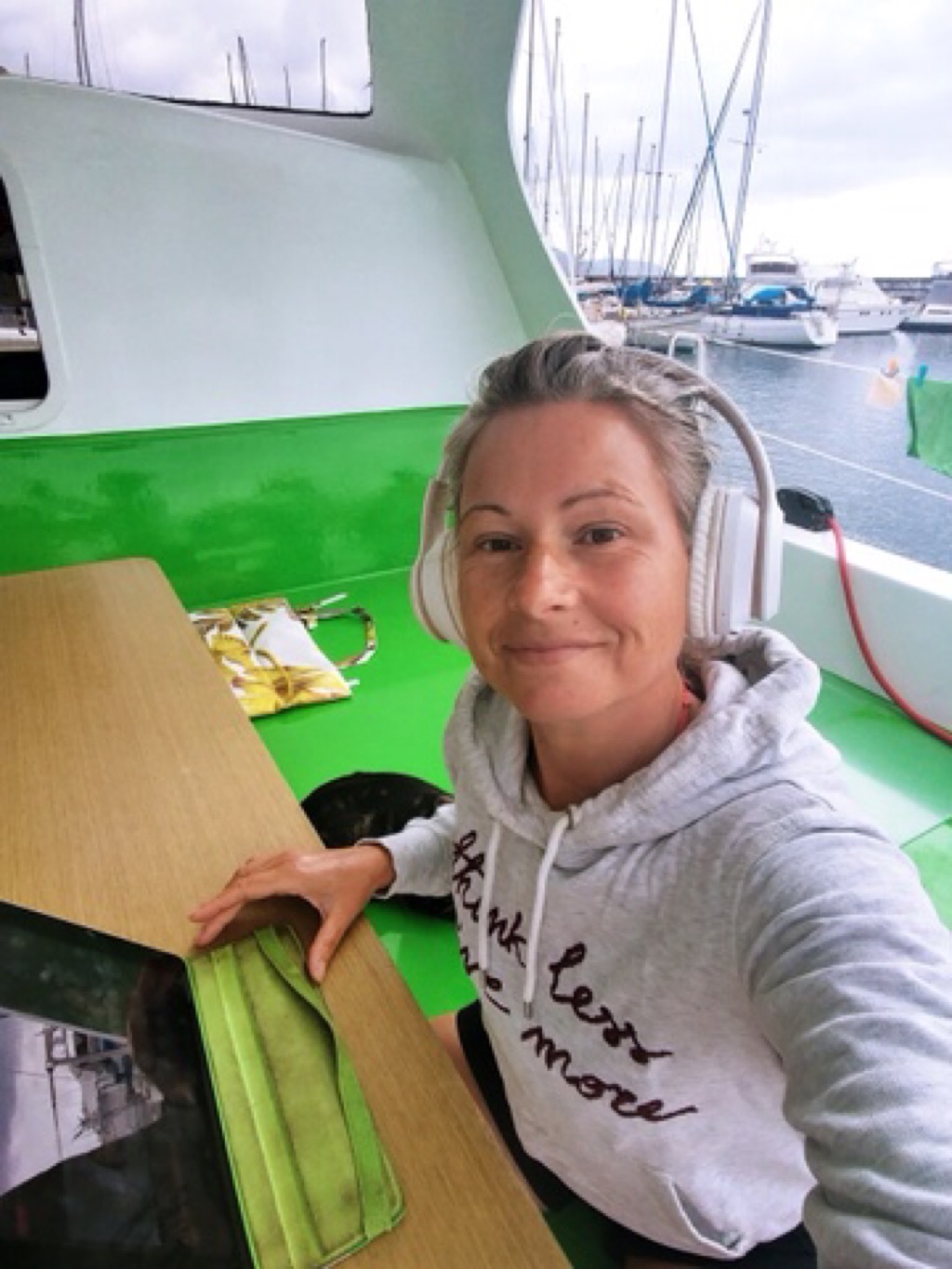 Bon, l’espace n’est pas si petit car je vis sur un catamaran : donc je dispose d’un vrai espace bureau avec un vrai PC. Cependant, comme il n’est pas toujours possible de rester assis sur un tabouret avec les conditions de mer, je travaille beaucoup de mon smartphone, ce qui me permet d’être allongée ou bien à l’air à l’extérieur.