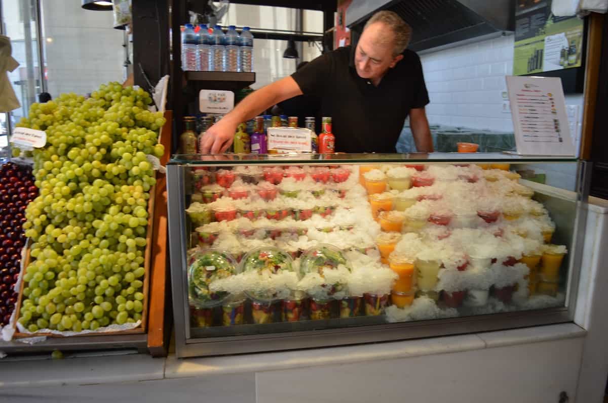 Patrice et Logan ont opté pour une salade de fruits et un smoothie qu’ils sont allés déguster à l’extérieur du marché. Alors que de mon côté je tentais tant bien que mal, au milieu de bousculades, d’immortaliser en quelques clichés l’ambiance du lieu et la diversité alimentaire proposé. Sans grand succès au vu de la qualité médiocre de mes photos.